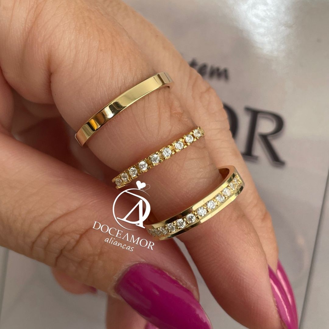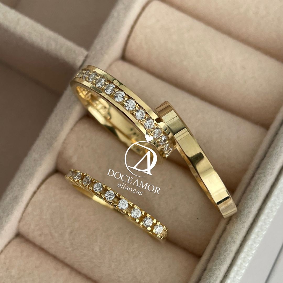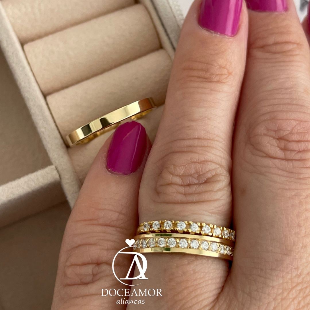 Detalhes: Aproximadamente 15 pedras de zircônia na aliança feminina (meia volta)