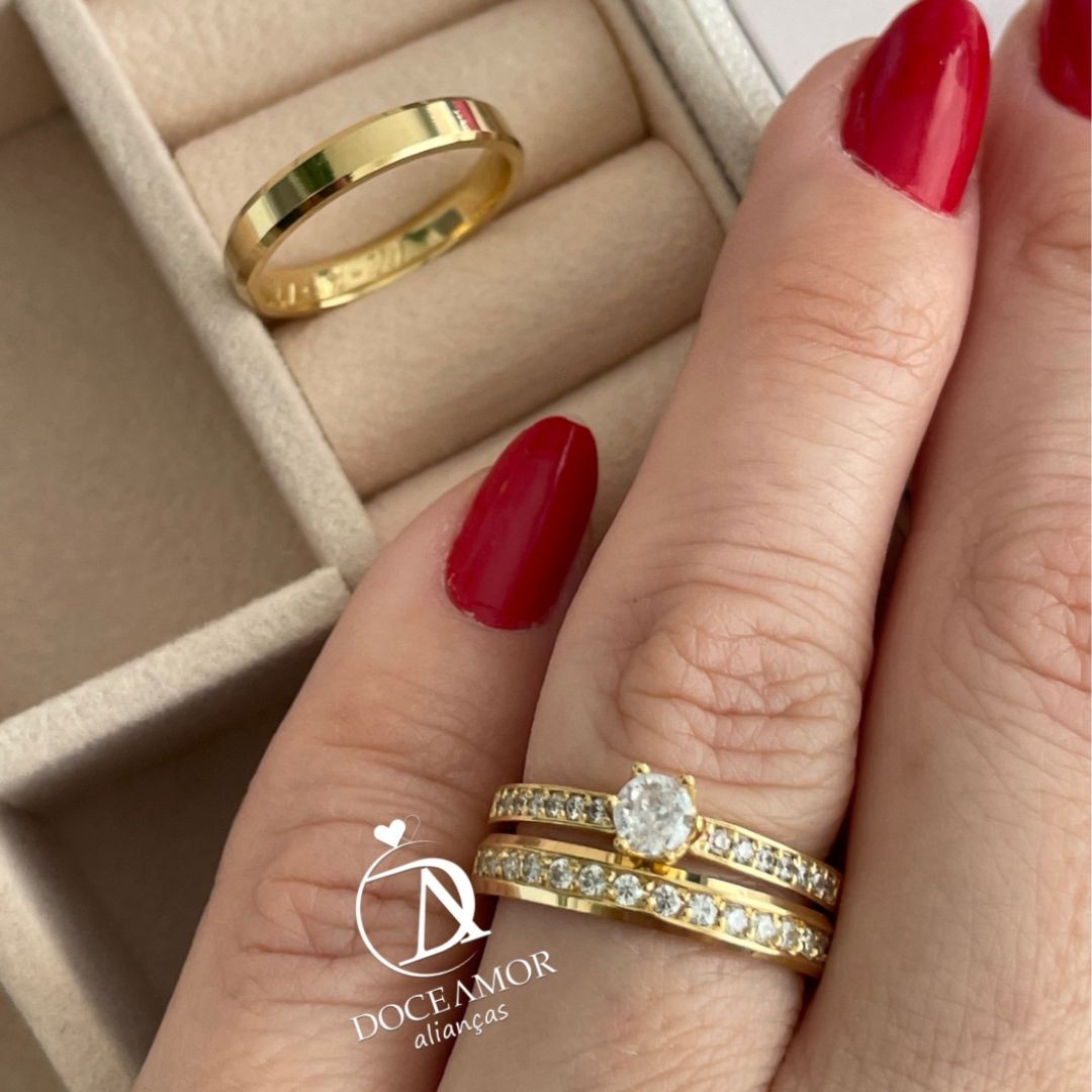 Detalhes: Aproximadamente 15 pedras de zircônia na aliança feminina (meia volta)