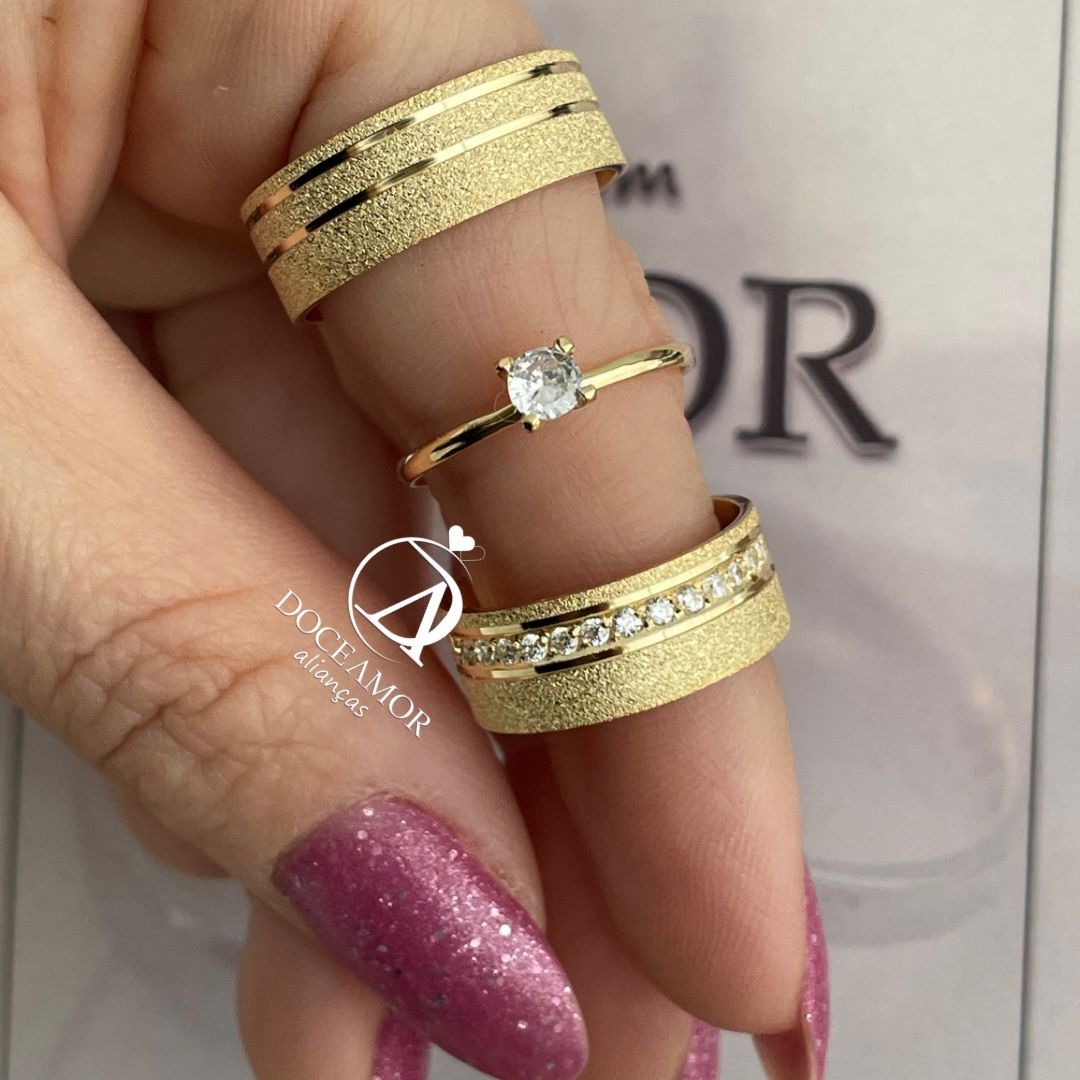 Detalhes: Aproximadamente 15 pedras de zircônias na aliança feminina (meia volta)