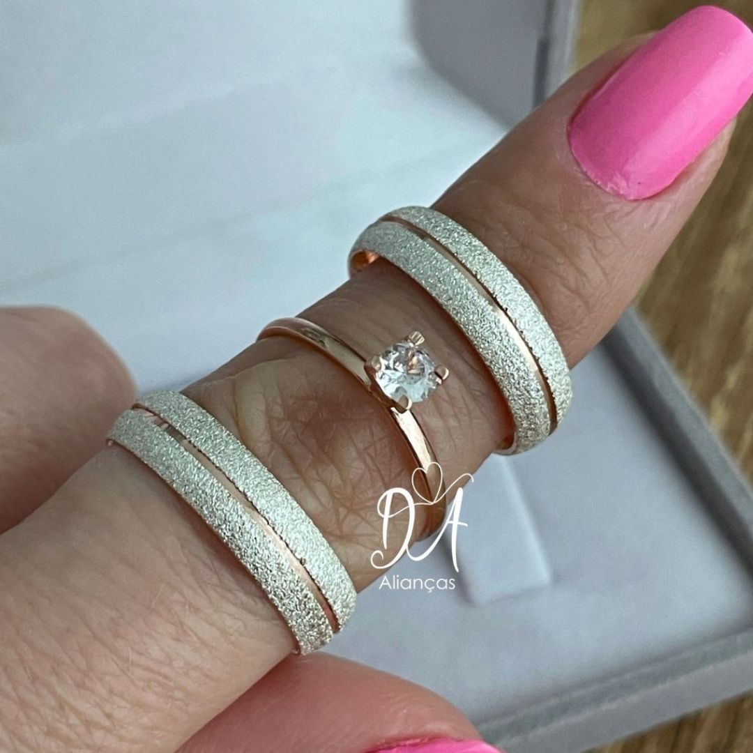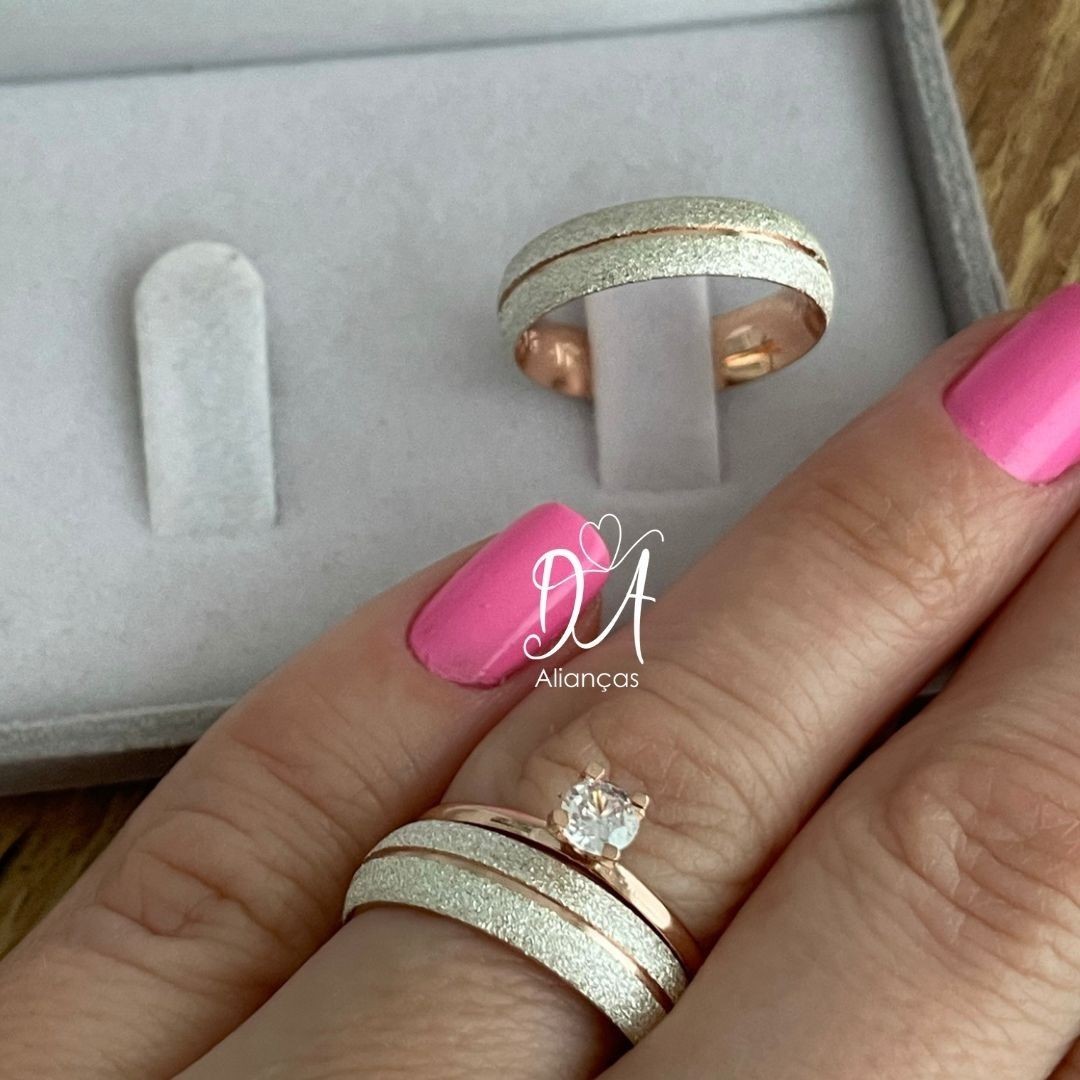 "As alianças banhadas a ouro rose combinam elegância e romantismo, oferecendo um brilho suave e sofisticado. Uma escolha perfeita para casais que buscam simbolizar o amor eterno com uma joia refinada e atemporal."