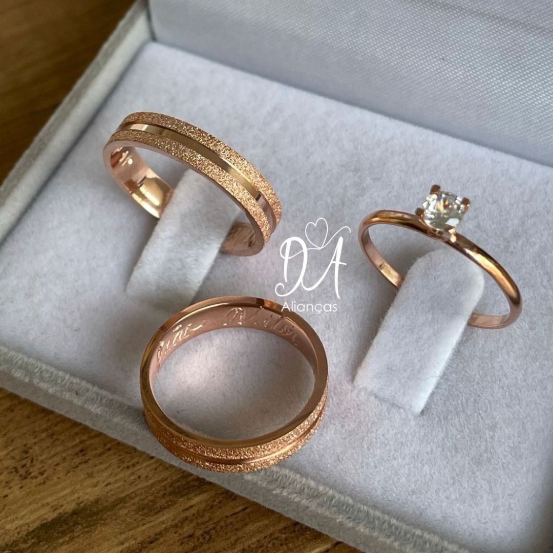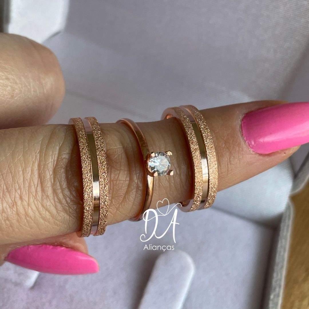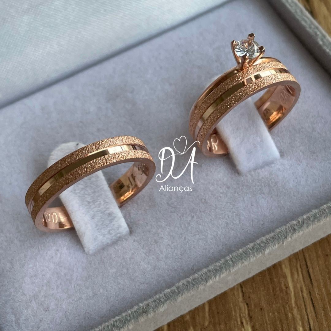 "As alianças banhadas a ouro rose combinam elegância e romantismo, oferecendo um brilho suave e sofisticado. Uma escolha perfeita para casais que buscam simbolizar o amor eterno com uma joia refinada e atemporal."