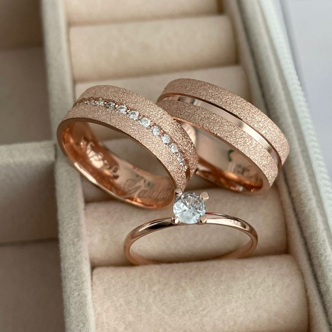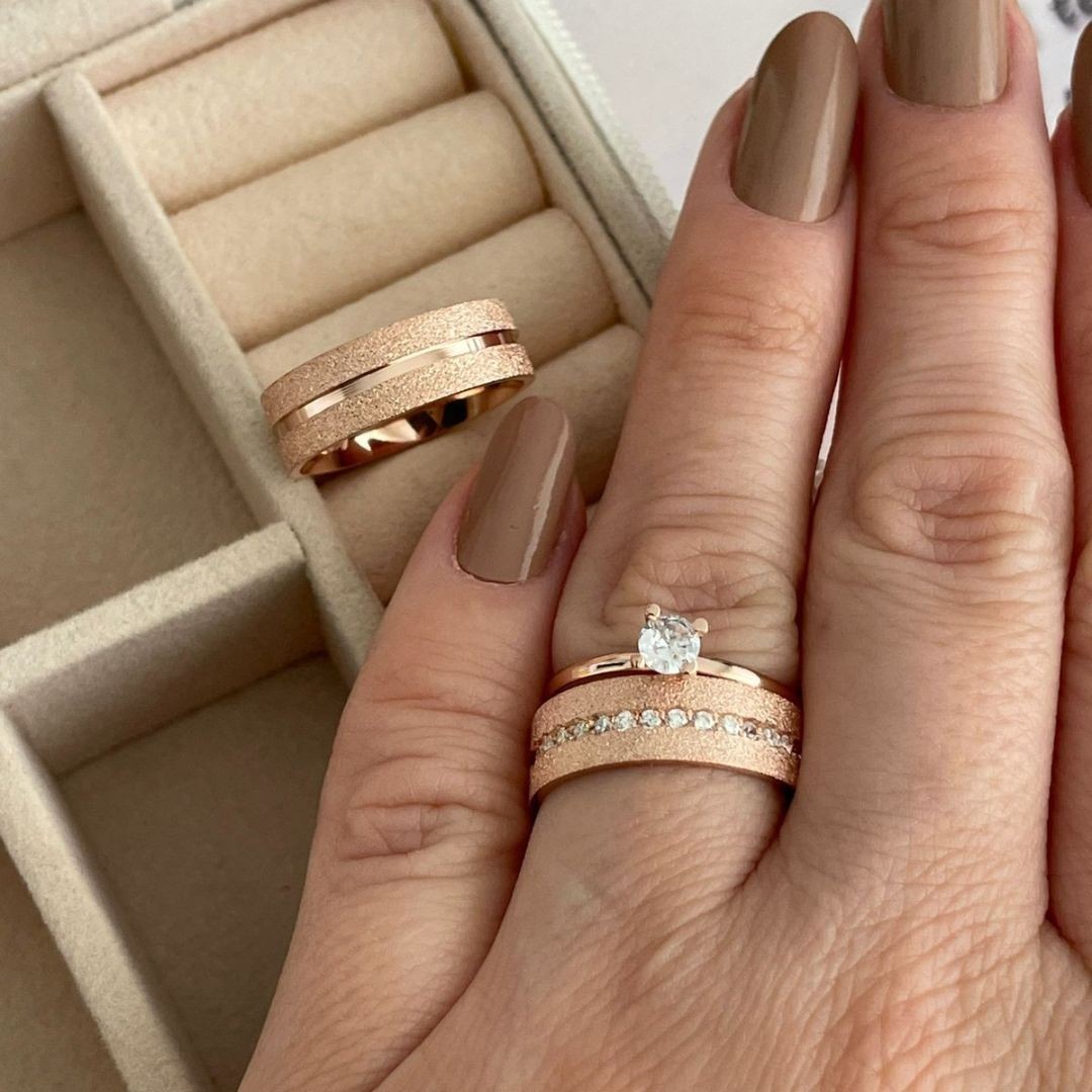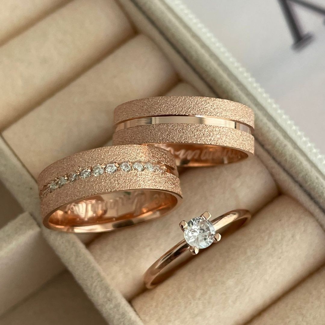 "As alianças banhadas a ouro rose combinam elegância e romantismo, oferecendo um brilho suave e sofisticado. Uma escolha perfeita para casais que buscam simbolizar o amor eterno com uma joia refinada e atemporal."