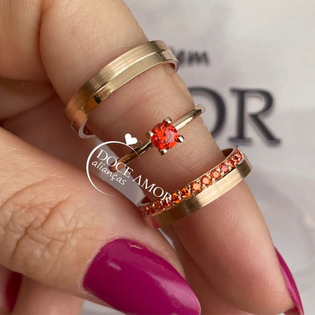 "Alianças com pedras laranjas trazem um toque vibrante e único à joia, simbolizando energia, paixão e criatividade. A cor intensa das pedras laranjas adiciona personalidade e luminosidade, tornando cada peça um reflexo de um amor vibrante e cheio de vida."