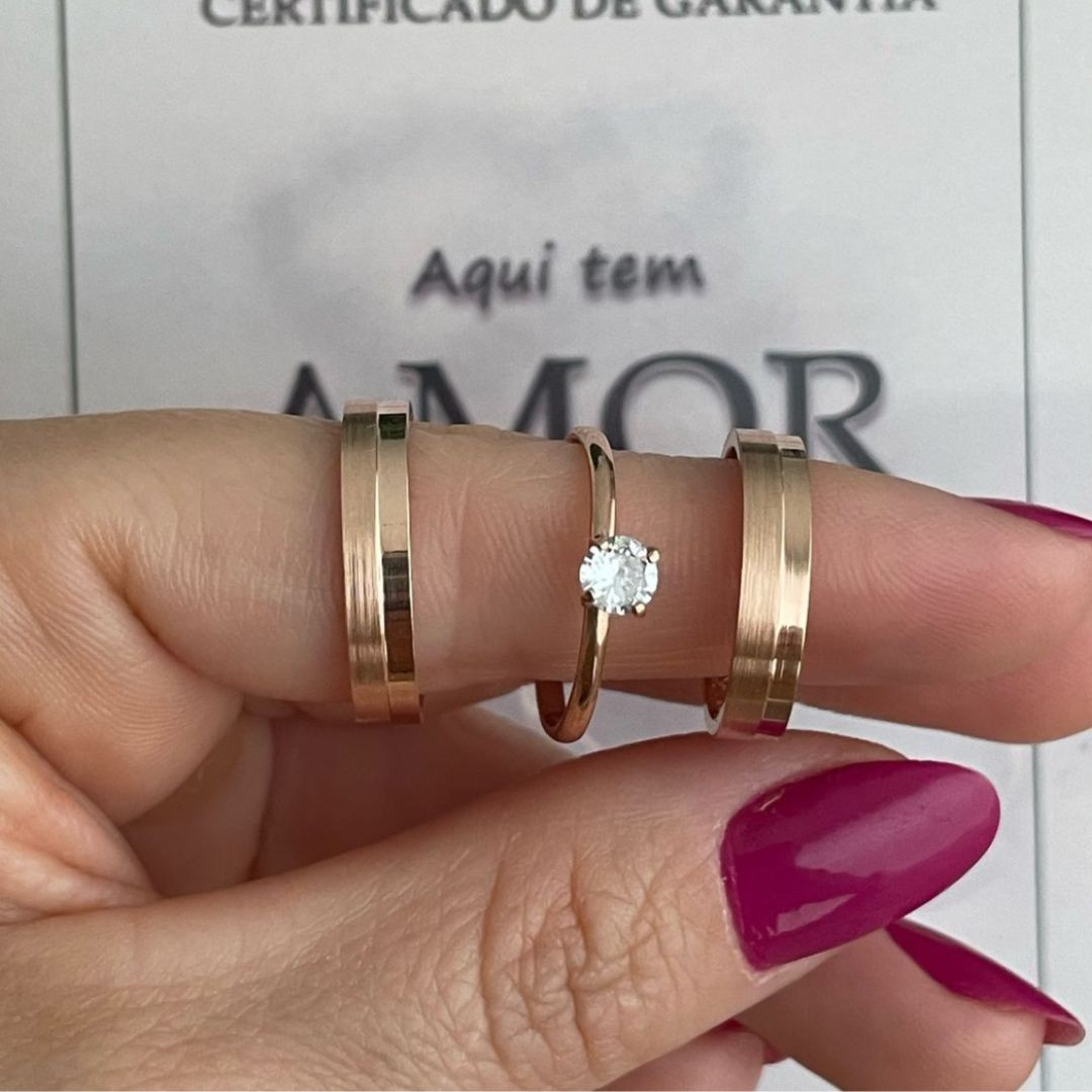"As alianças banhadas a ouro rose combinam elegância e romantismo, oferecendo um brilho suave e sofisticado. Uma escolha perfeita para casais que buscam simbolizar o amor eterno com uma joia refinada e atemporal."