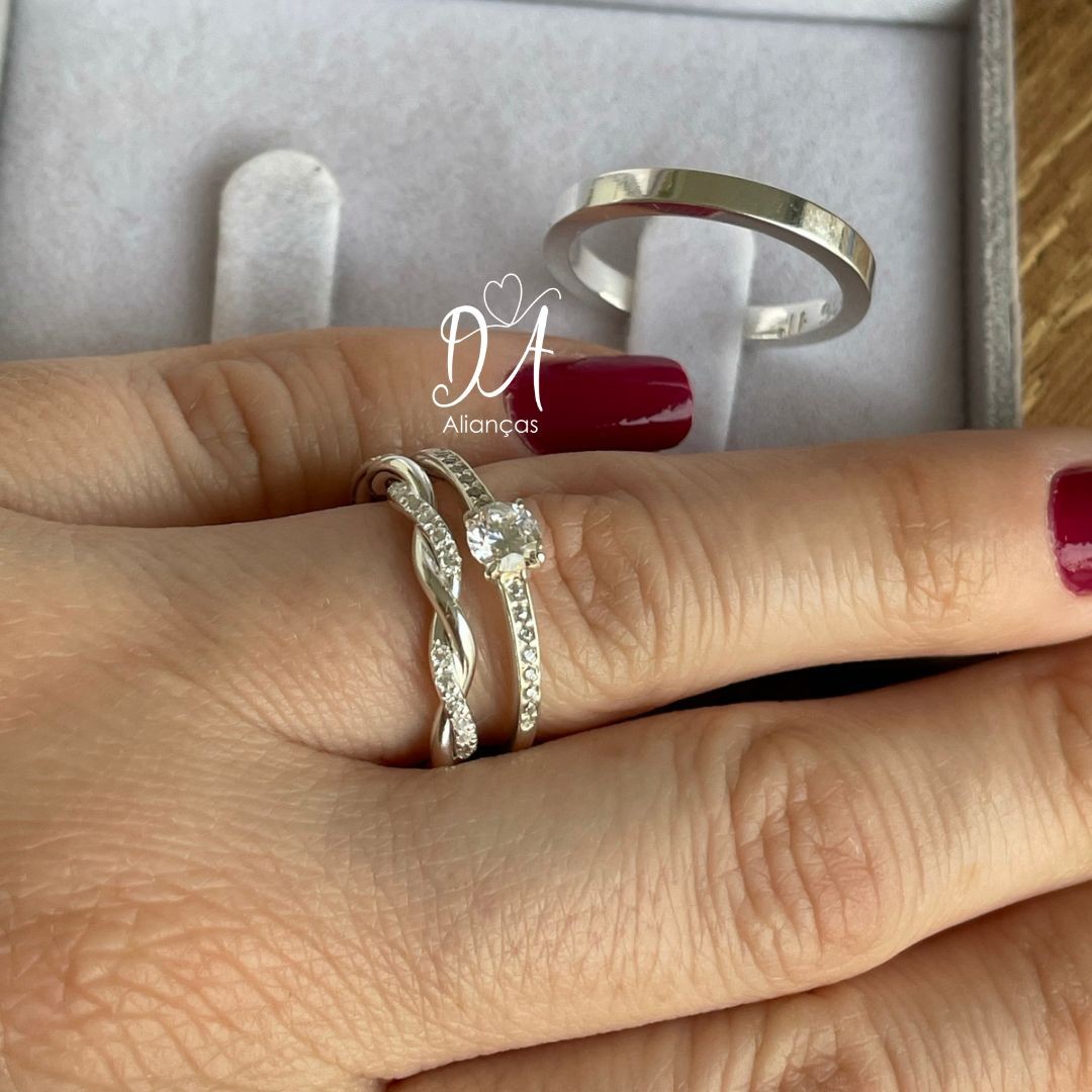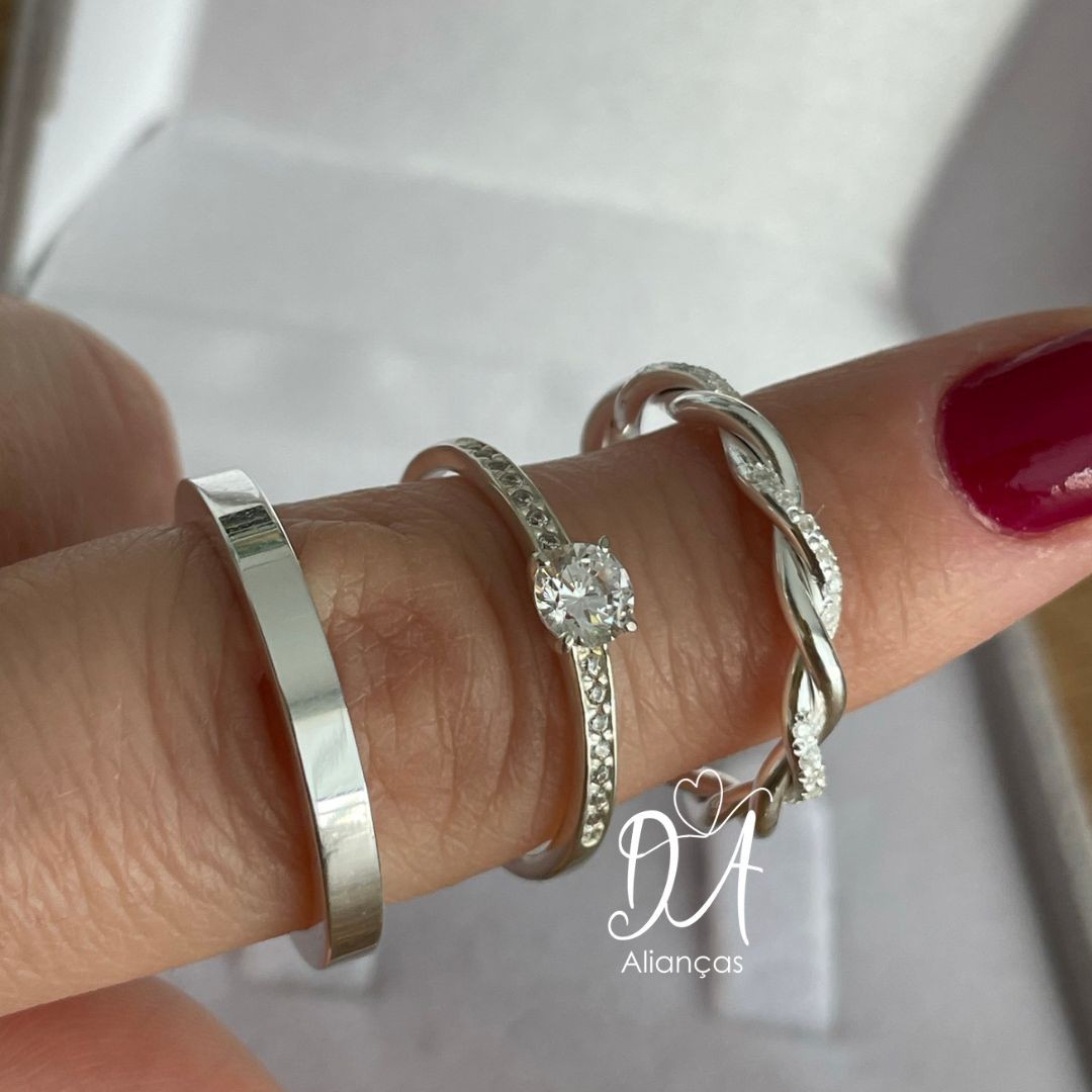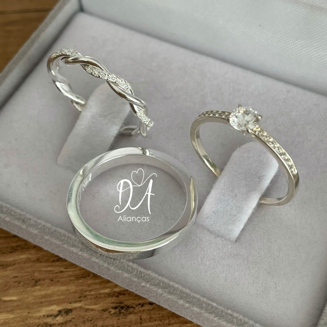 Detalhes: Aproximadamente 24 pedras de zircônia na aliança feminina (meia volta)