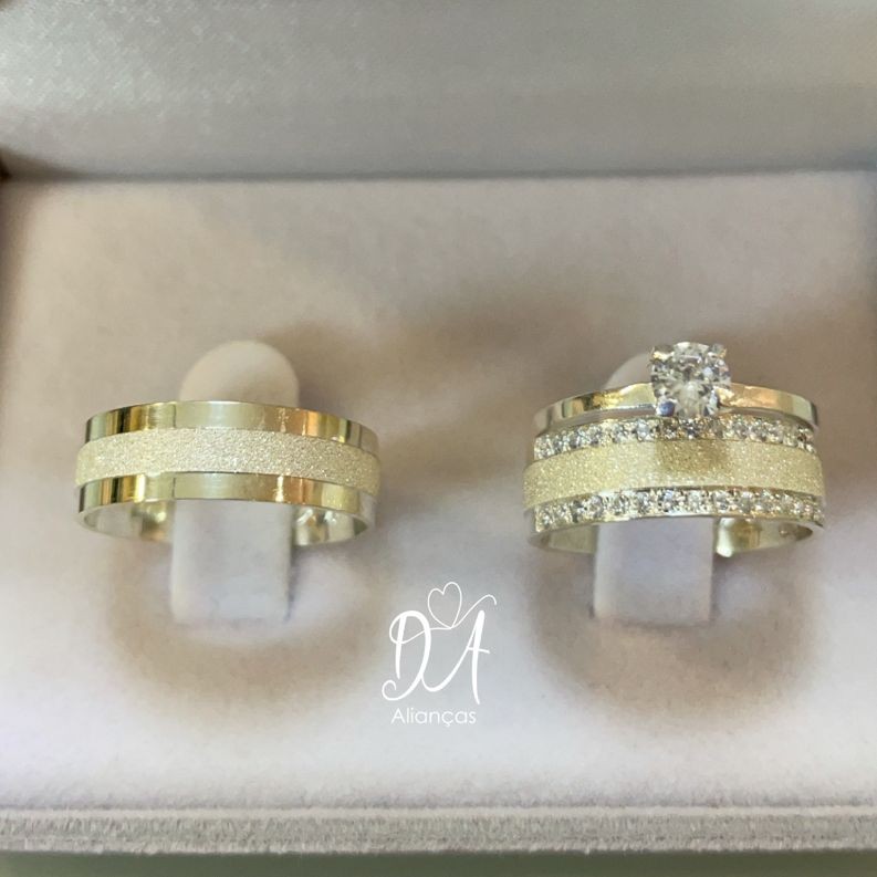 Acabamento: Masculina Polida com centro fosco diamantado e Feminina fosca diamantada com Pedras de Zircônia