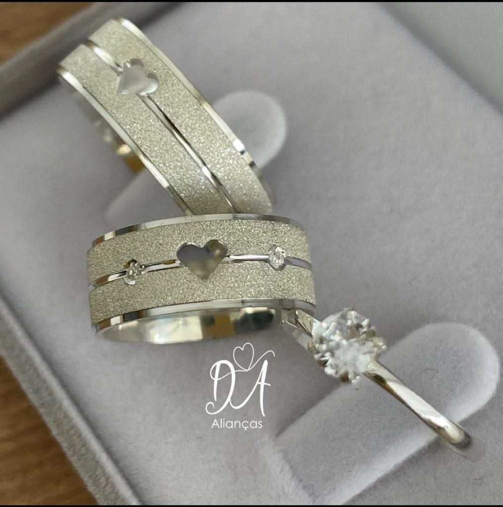 Detalhes: Coração Vazado na aliança masculina e Aliança feminina com duas pedrinhas de zircônia cravadas e coração vazado