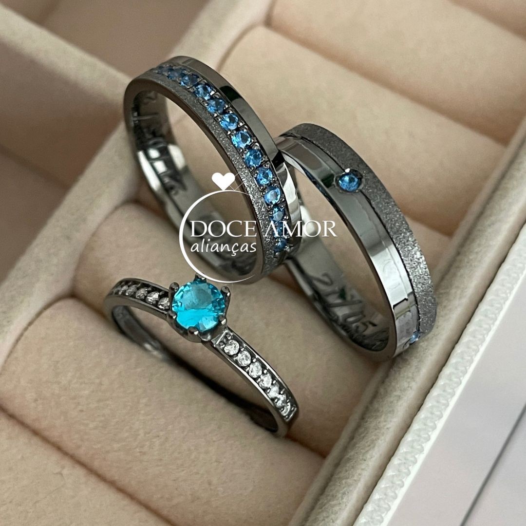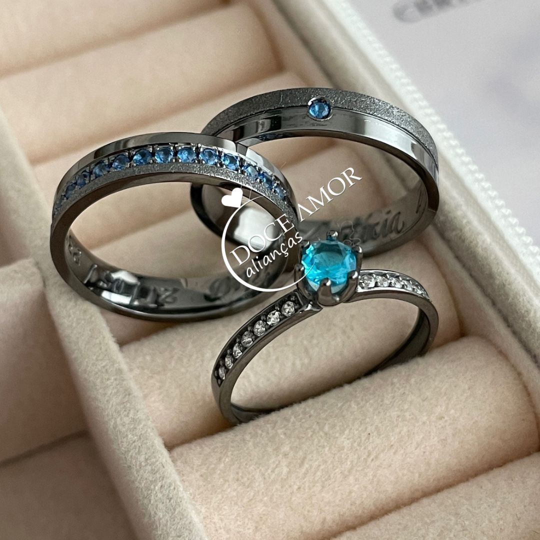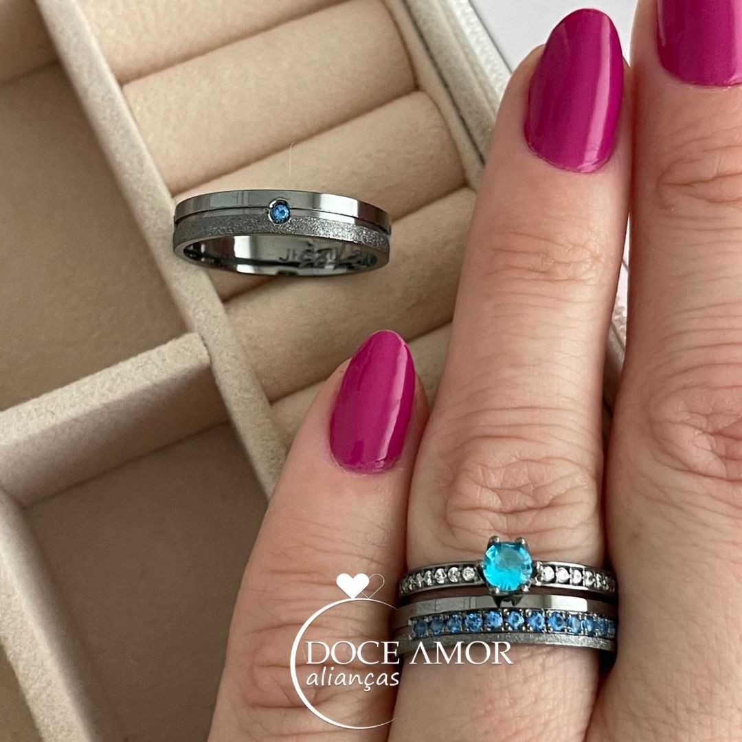 Detalhes: 4 pedras de zircônia nas laterais da masculina e meia volta de zircônias na peça feminina (aproximadamente 15 pedras)