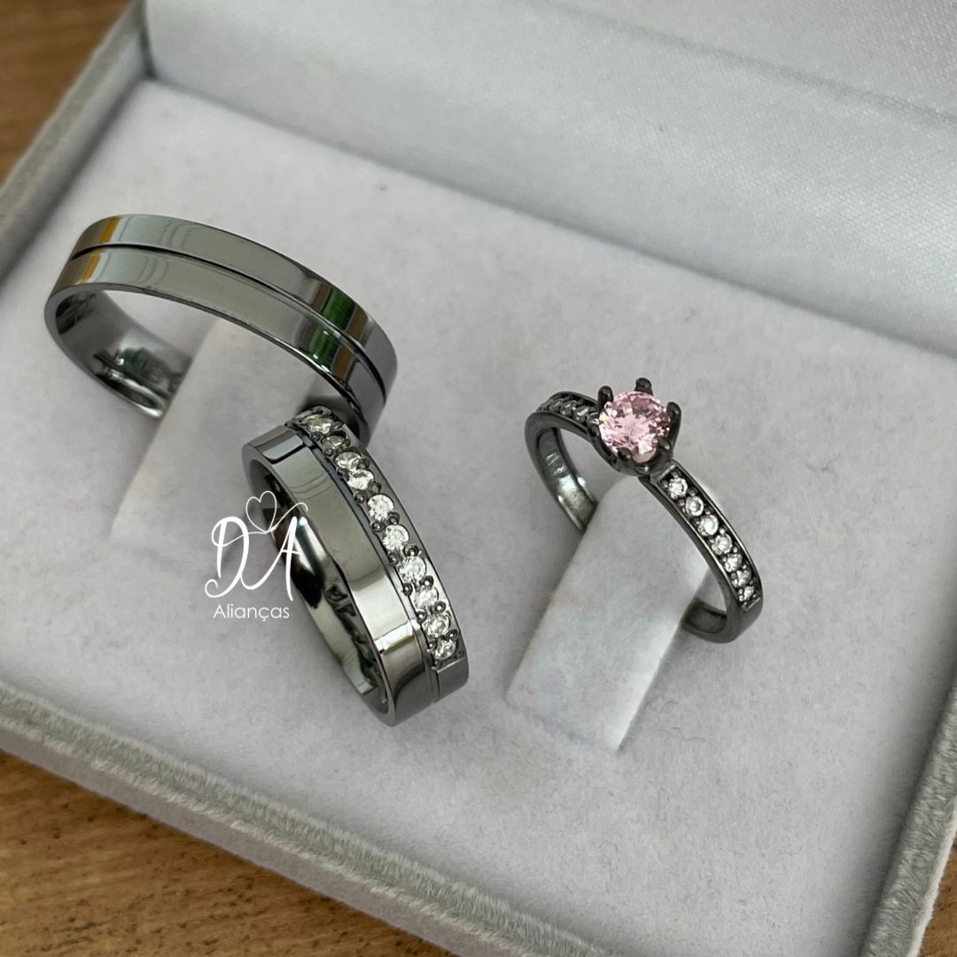 Detalhes : Aproximadamente 15 pedras de zircônia na aliança feminina (meia Volta)