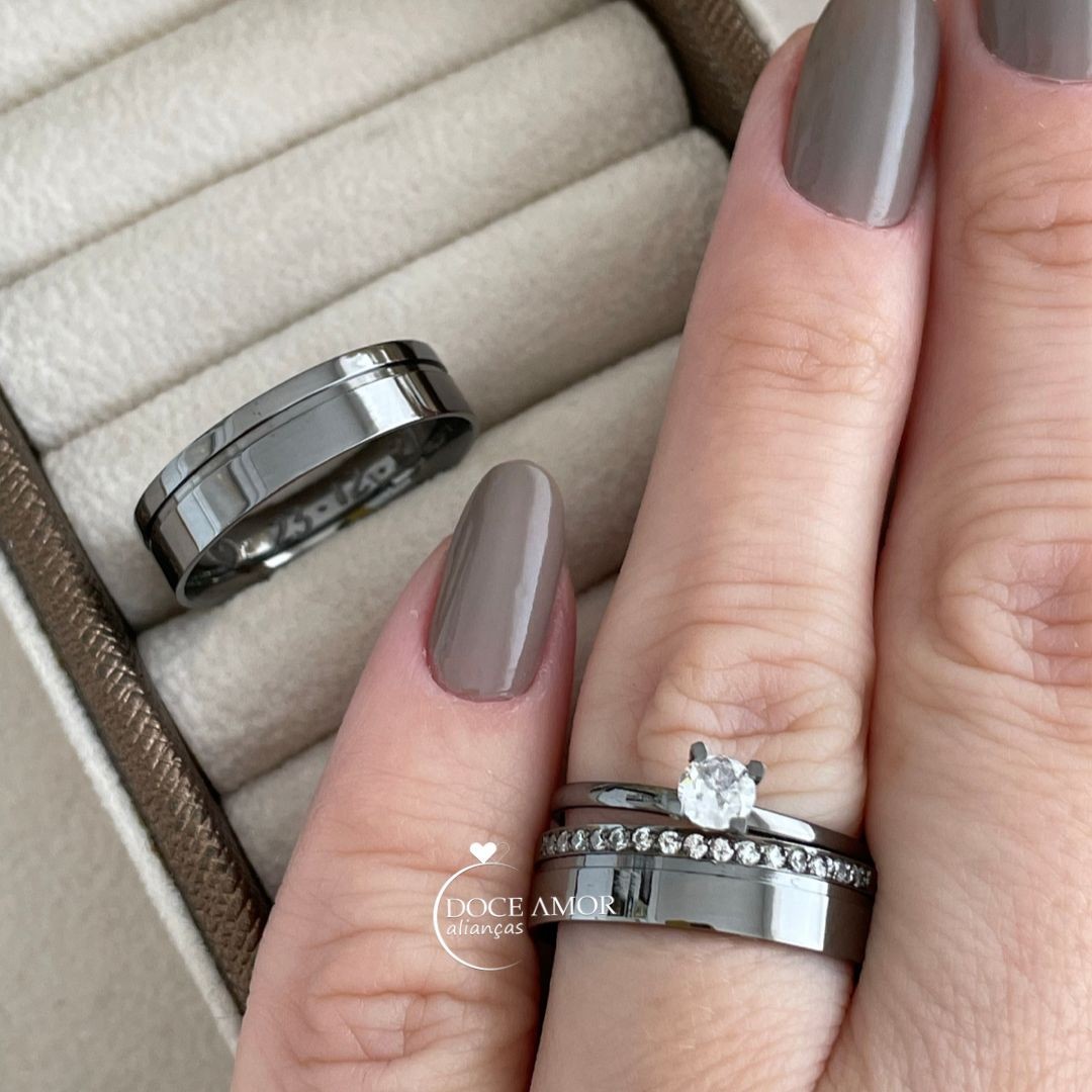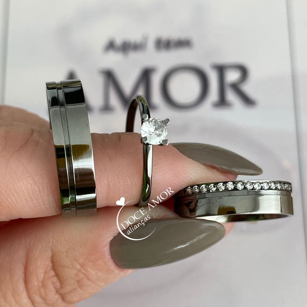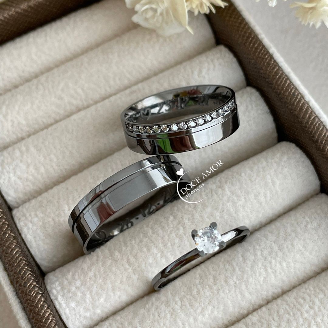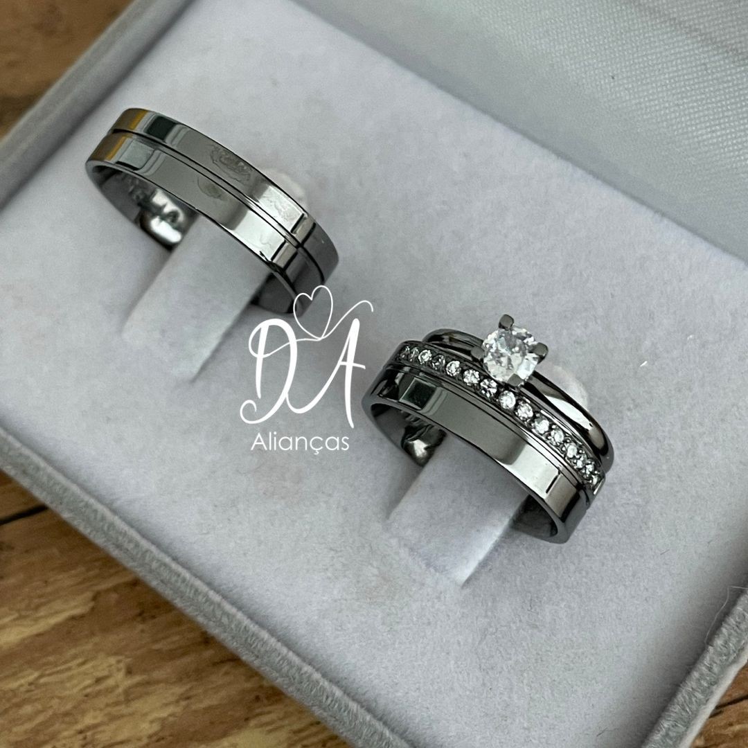 Detalhes : Aproximadamente 15 pedras de zircônia na aliança feminina (meia Volta)