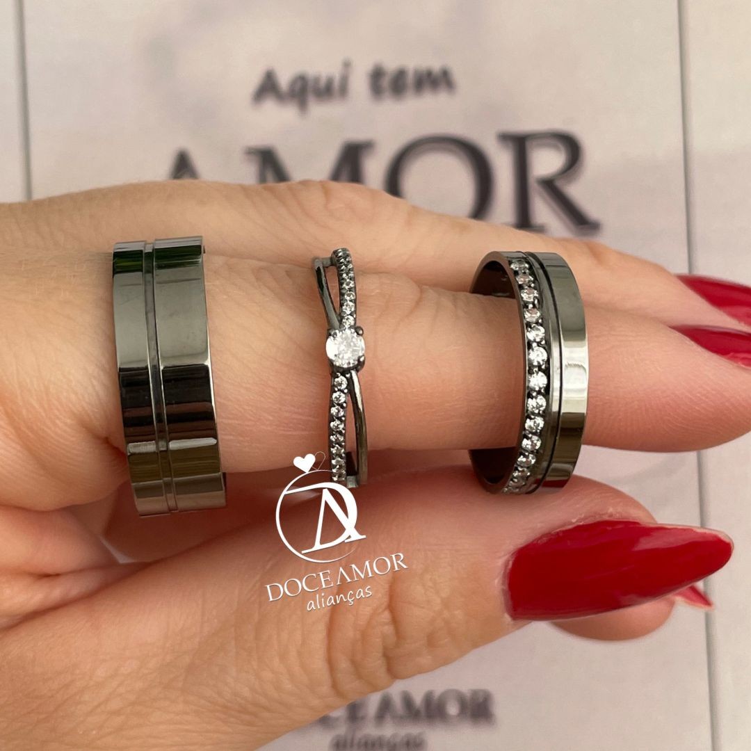Detalhes : Aproximadamente 15 pedras de zircônia na aliança feminina (meia Volta)