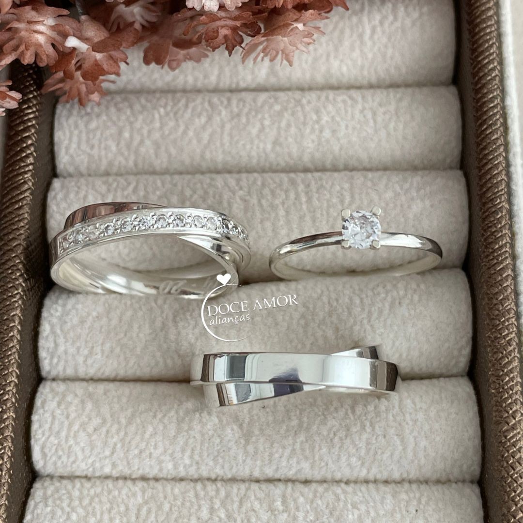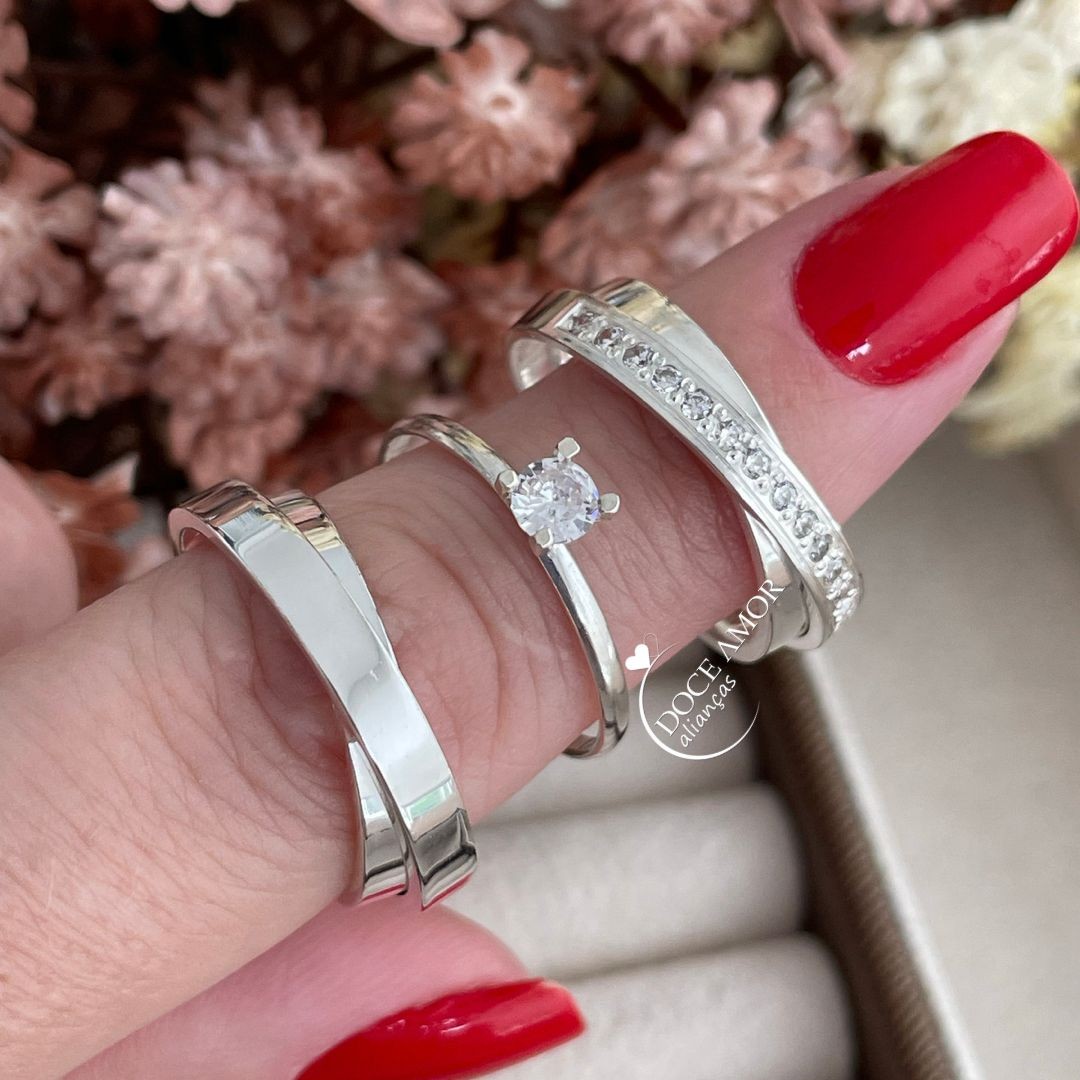 Detalhes: Aproximadamente 15 pedras de zircônia cravadas (Meia Volta) na Aliança Feminina